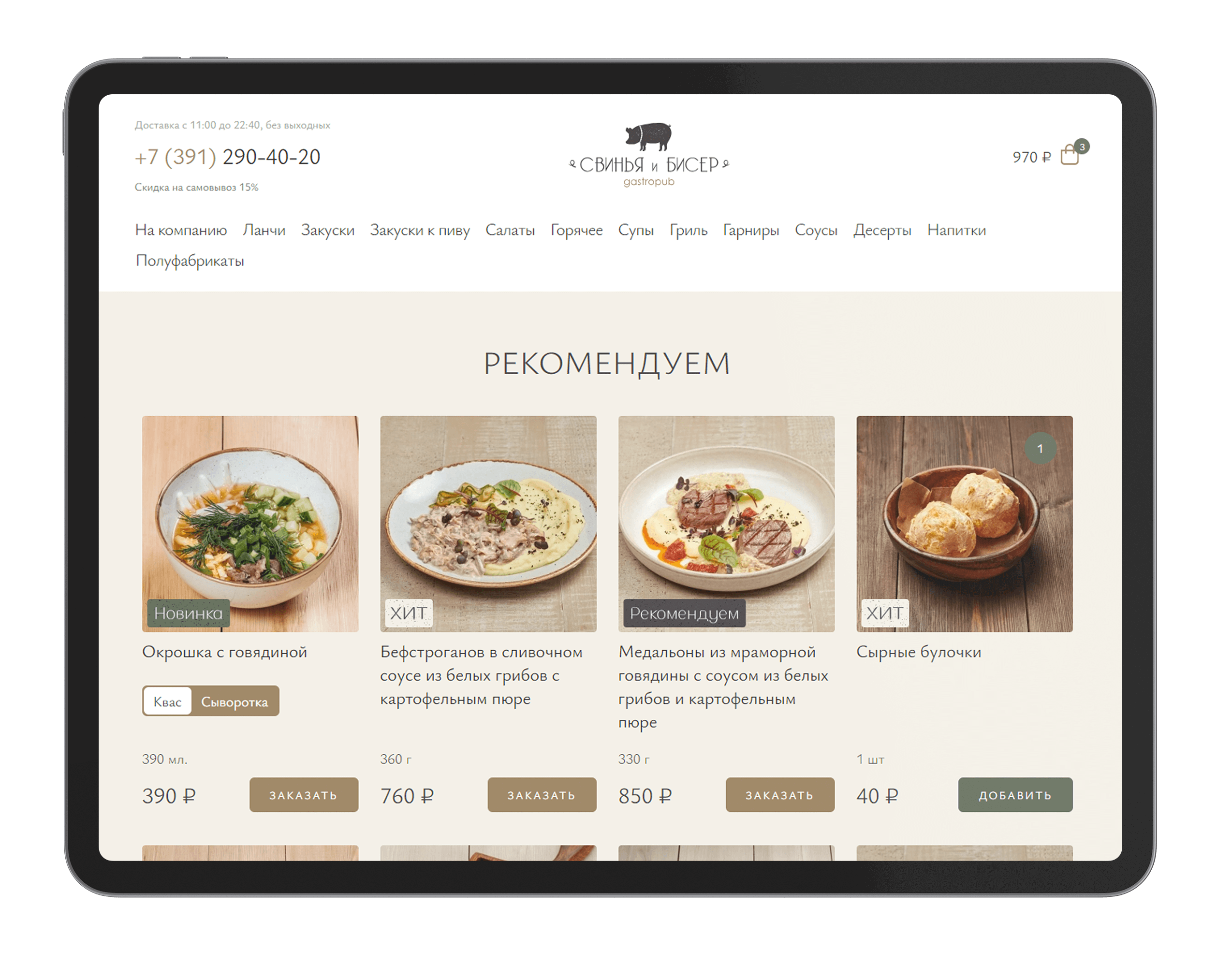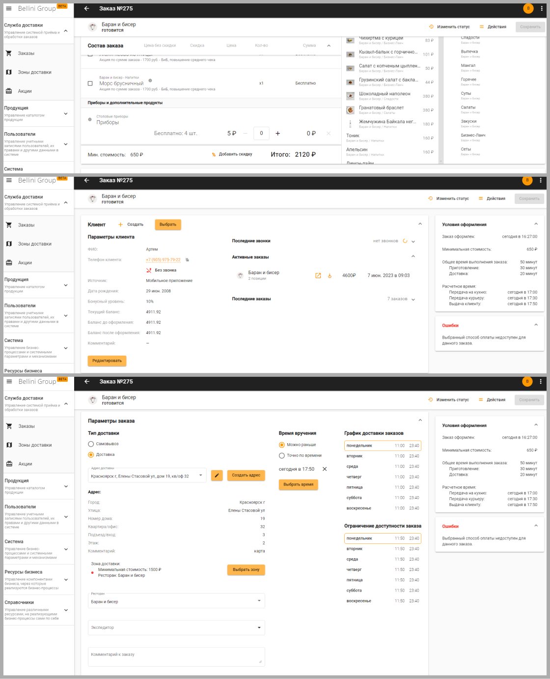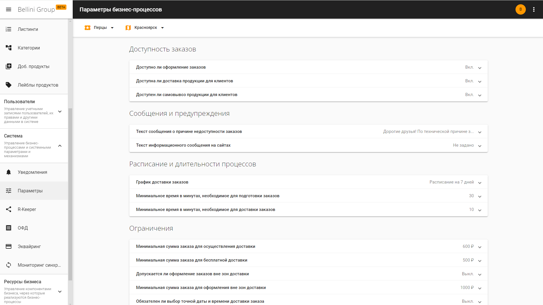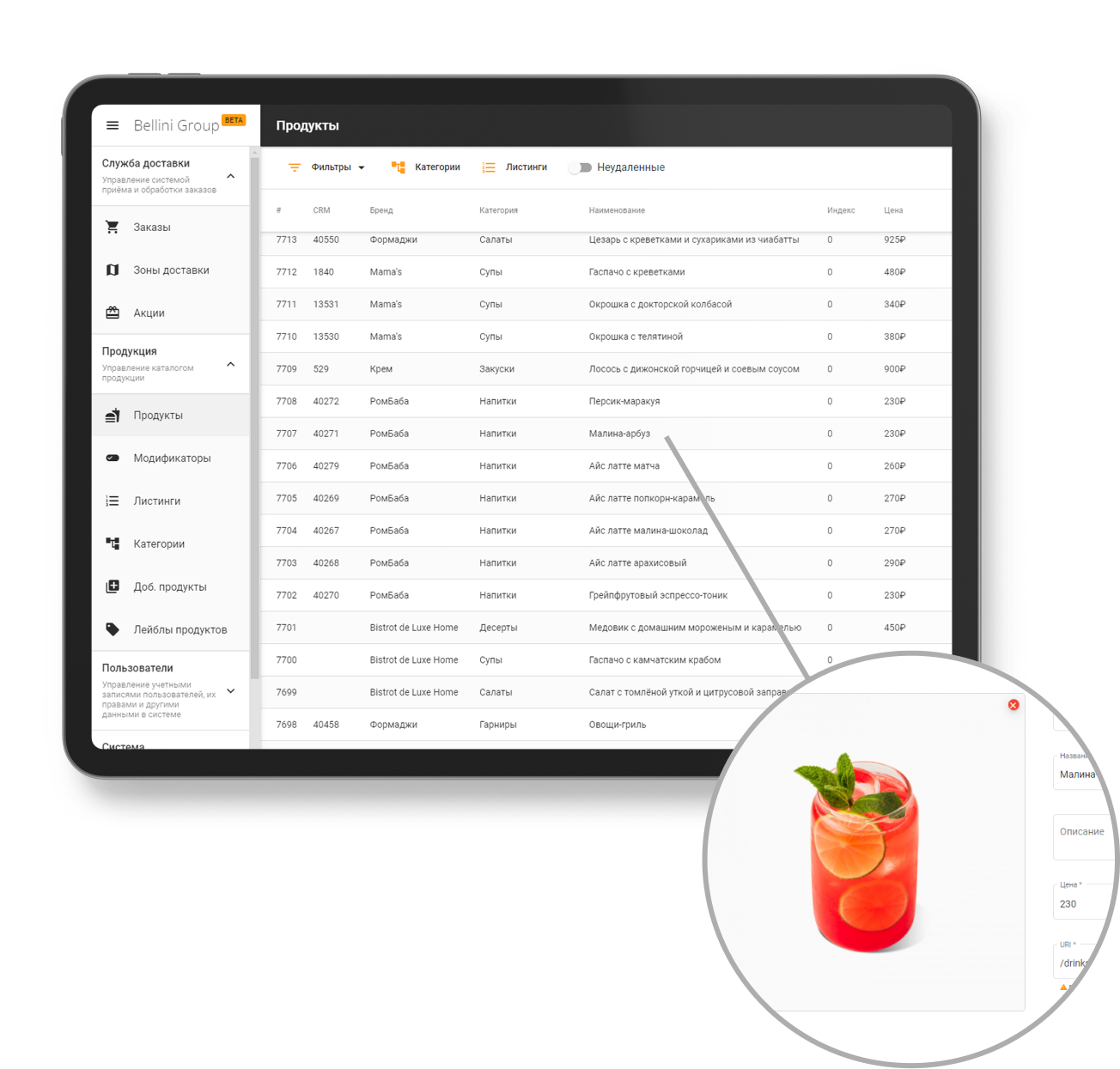 - Управление продуктами (Категория блюда, Стоимость, Применимость акций, Использование баллов лояльности, Активность, Расписание доступности по датам и времени суток,